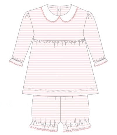 Soft white pima cotton. White picot trim on collar. Fit is tts. Snaps in crotch...